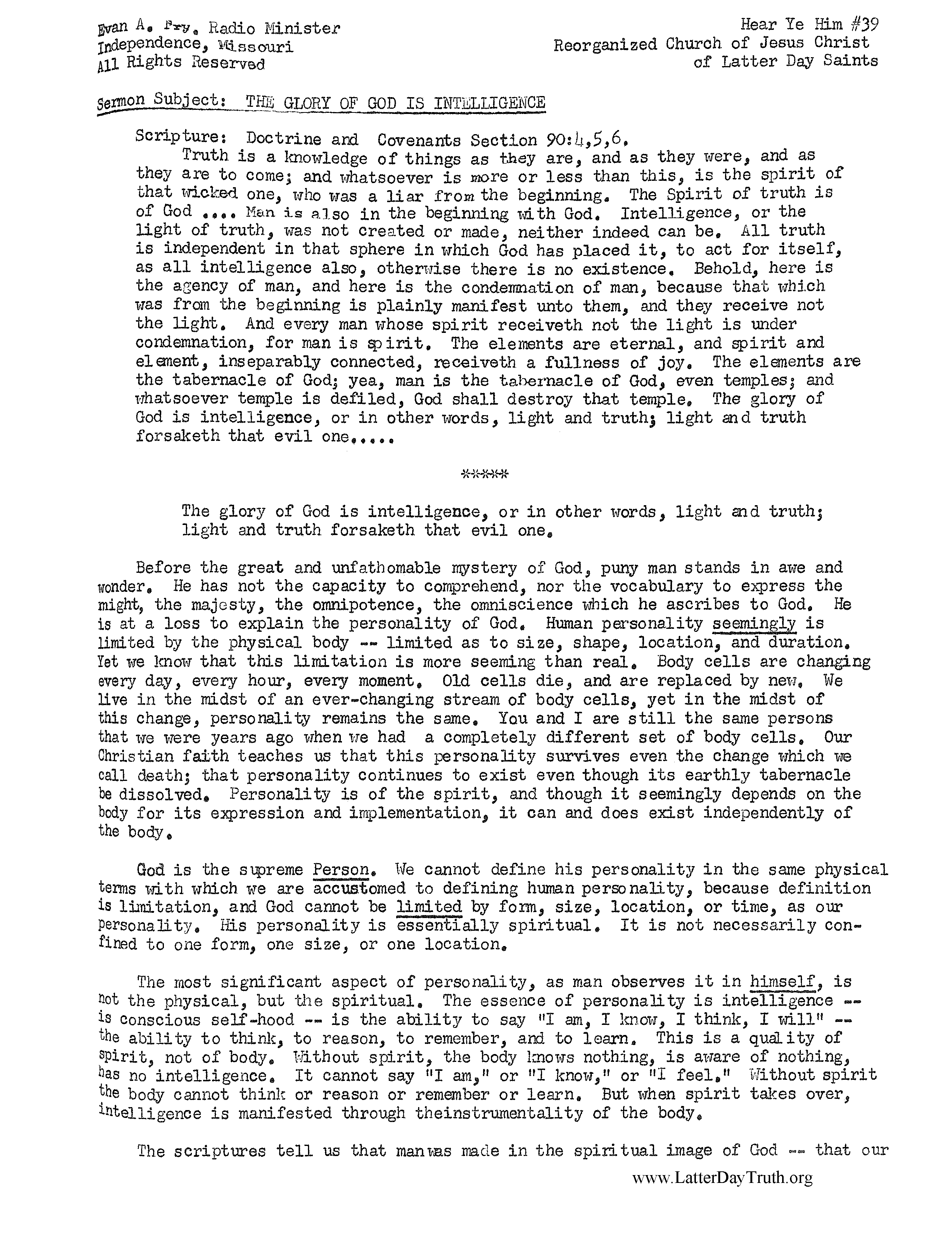 This electronic publication copyright © 2024 LatterDayTruth.org; All Rights Reserved.Original script for sermon #39 of the Hear Ye Him Radio series, a 14 minute sermon by Evan A. Fry given on September 27, 1953. He states, "If the glory of God is intelligence; if God is the source of all intelligence, which is eternal and uncreated even as God himself is eternal and uncreated, then all of our efforts to gain intelligence, wisdom, or knowledge must be God-centered. 'The fear of the Lord is the beginning of wisdom.' Any man who would be God-like must become intelligent as God is intelligent -- must partake of his creative, intelligent Spirit -- the Spirit which teaches men all things, and guides them into all truth. Man cannot be ignorant, and be truly religious."