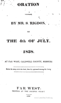 This electronic publication copyright © 2010 LatterDayTruth.org; All Rights Reserved.Contains revelations received through Joseph Smith, Jr., chapters 1 to 65. Published by W. W. Phelps in Independence, Missouri, USA. A mob destroyed the printing press before all the revelations could be printed.